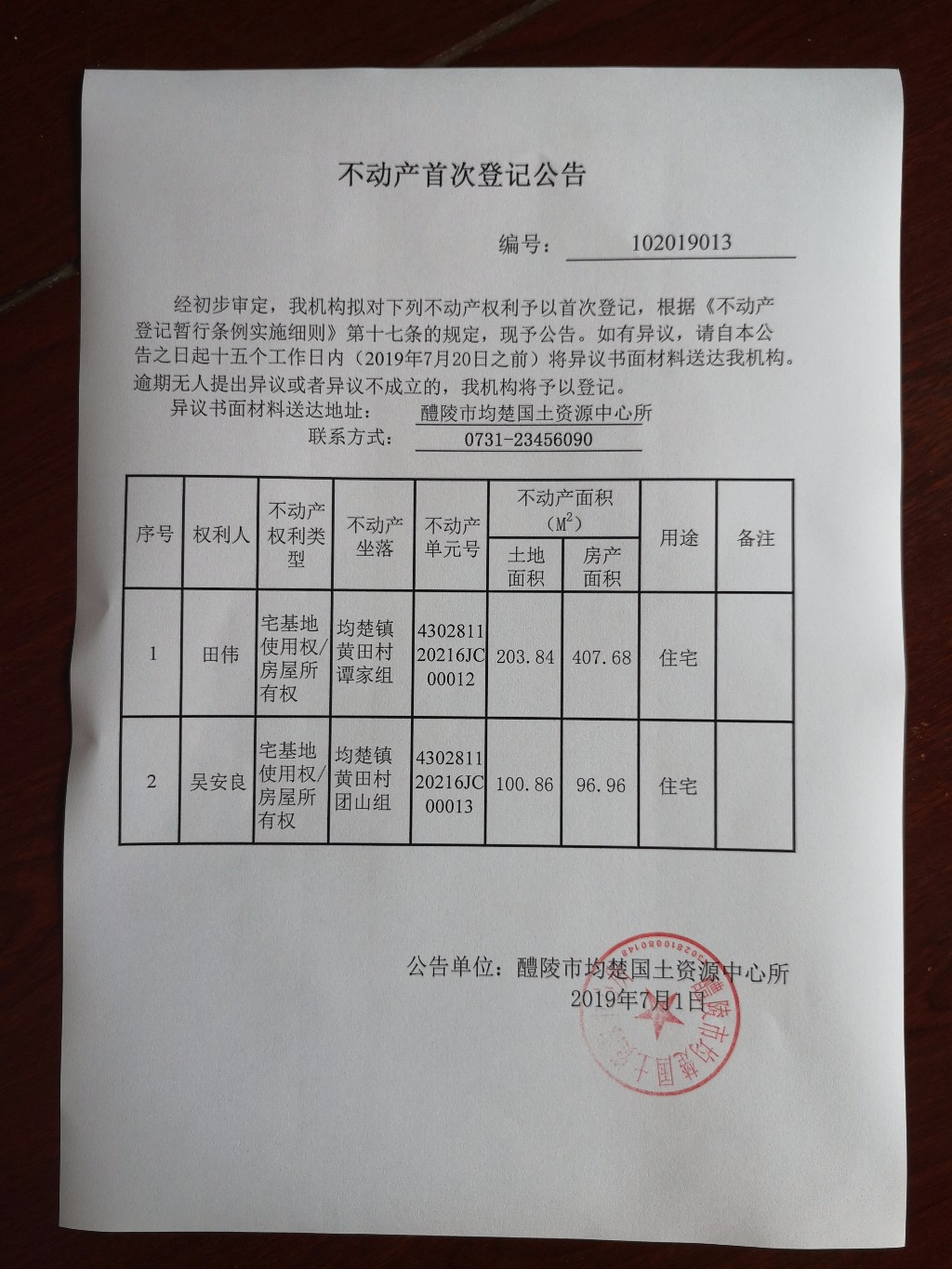 不动产首次登记公告(田伟、吴安良)