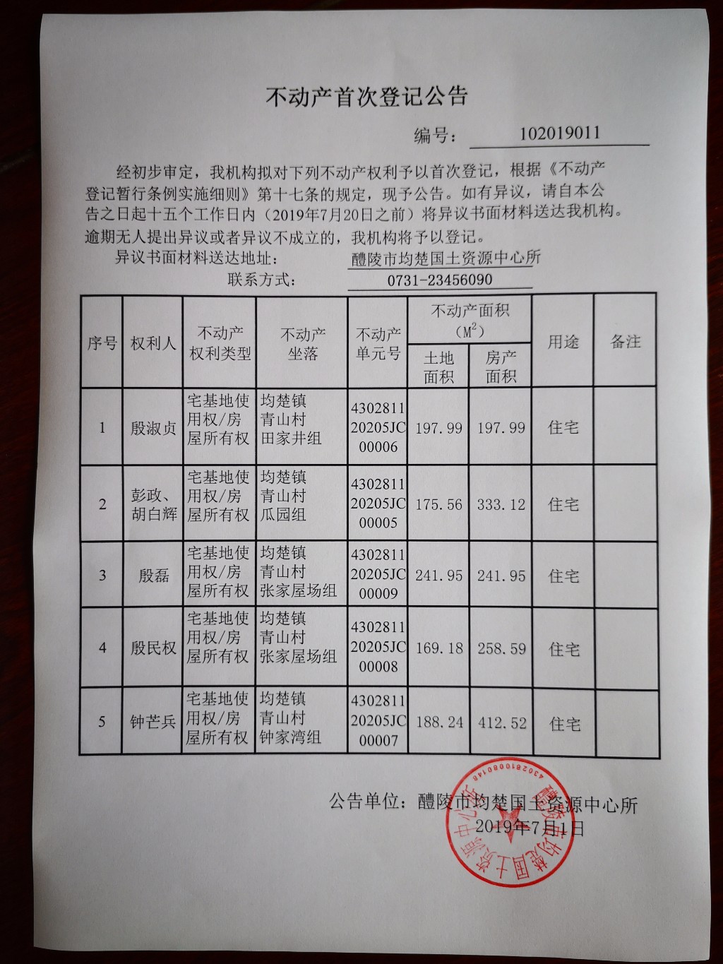 不动产首次登记公告(殷淑贞、彭政、胡白辉、殷磊、殷民权、钟芒兵)