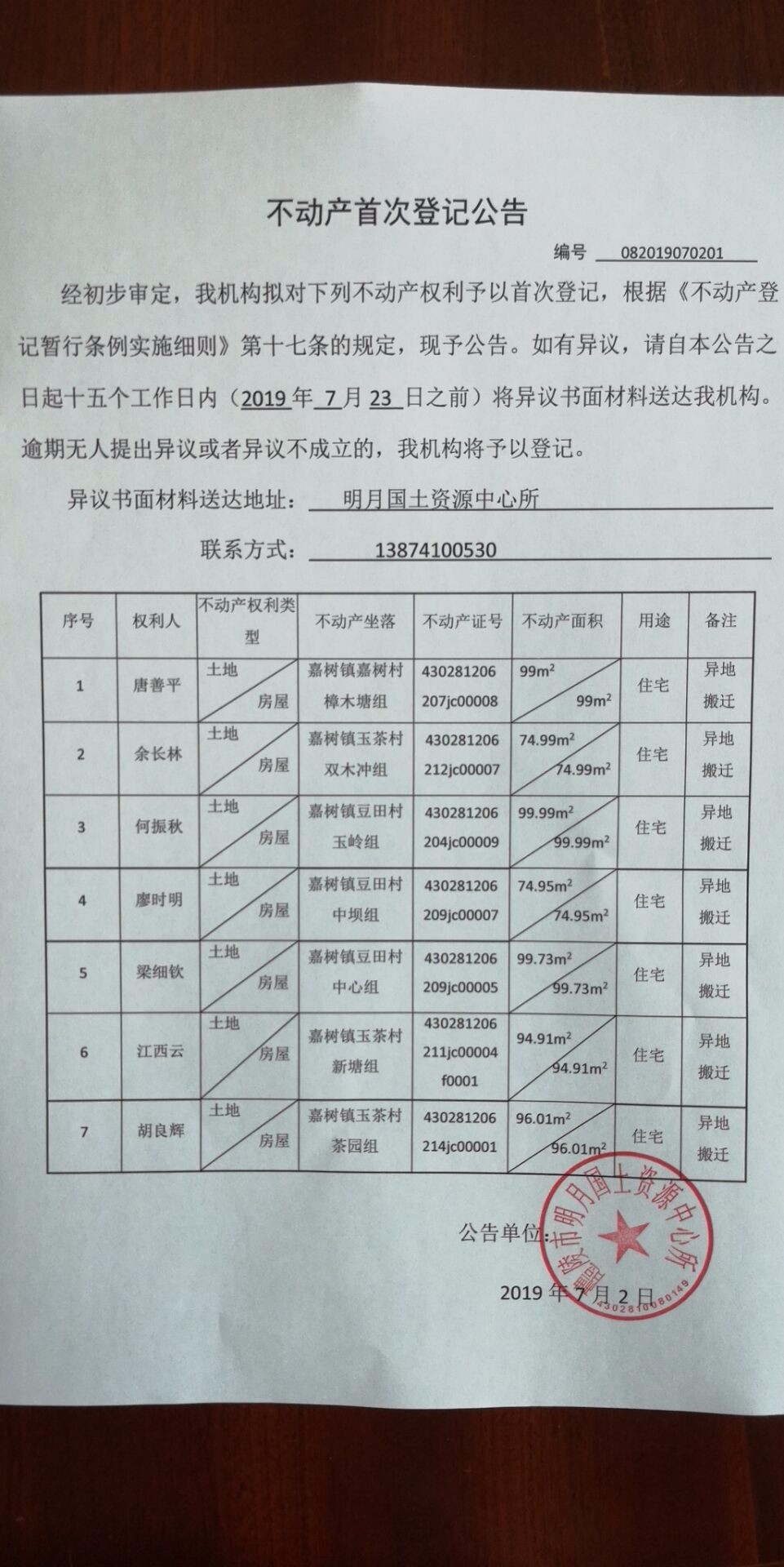 不动产首次登记公告(唐善平 余长林 何振秋 廖时明 梁细钦 江西云 胡良辉)