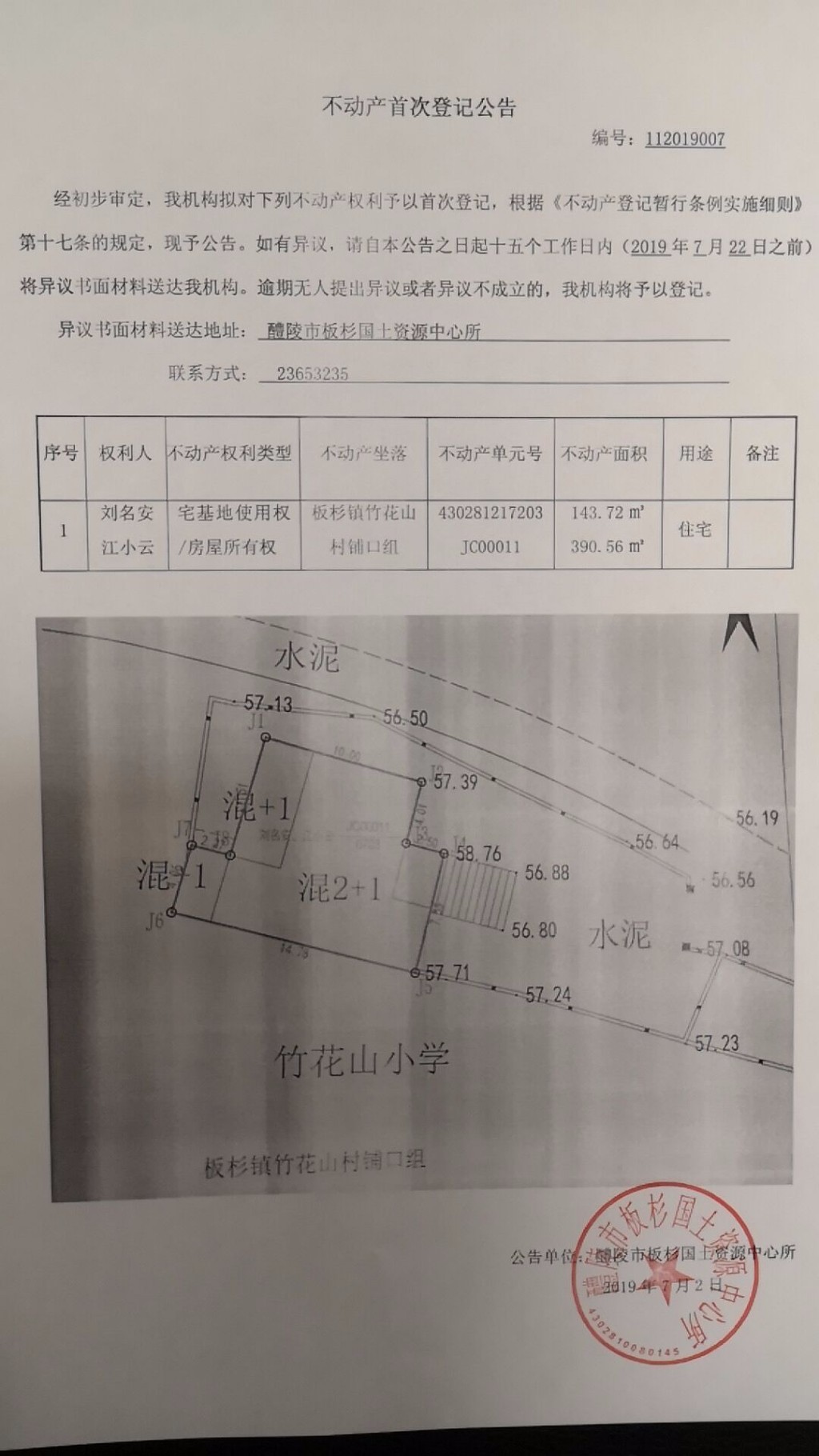 不动产首次登记公告(刘名安、江小云)