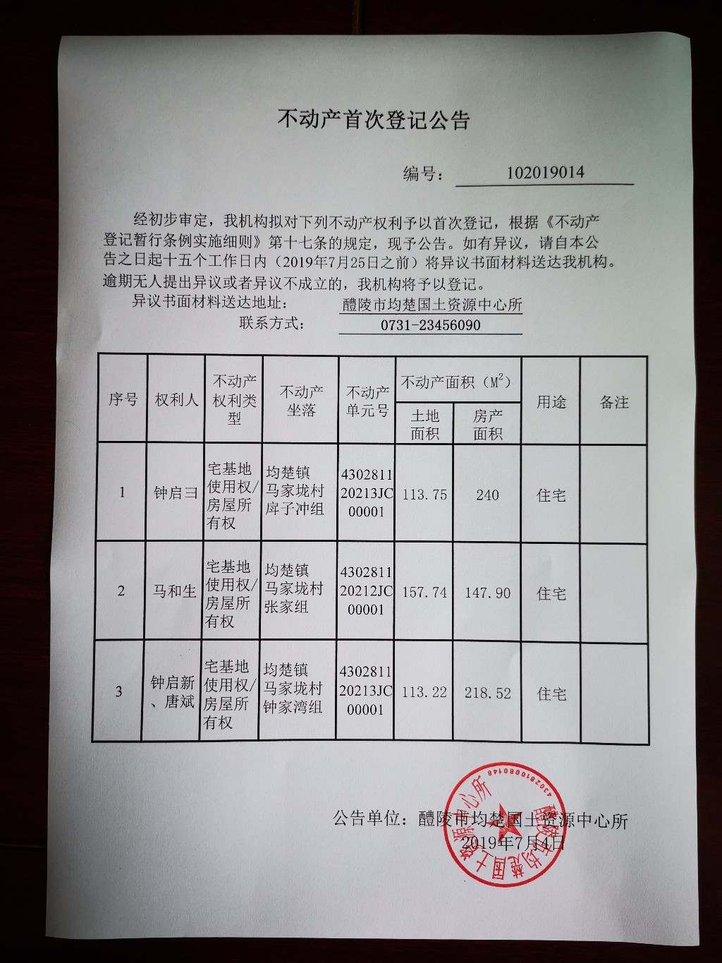 不动产首次登记公告(钟启彐 马和生 钟启新、唐斌)