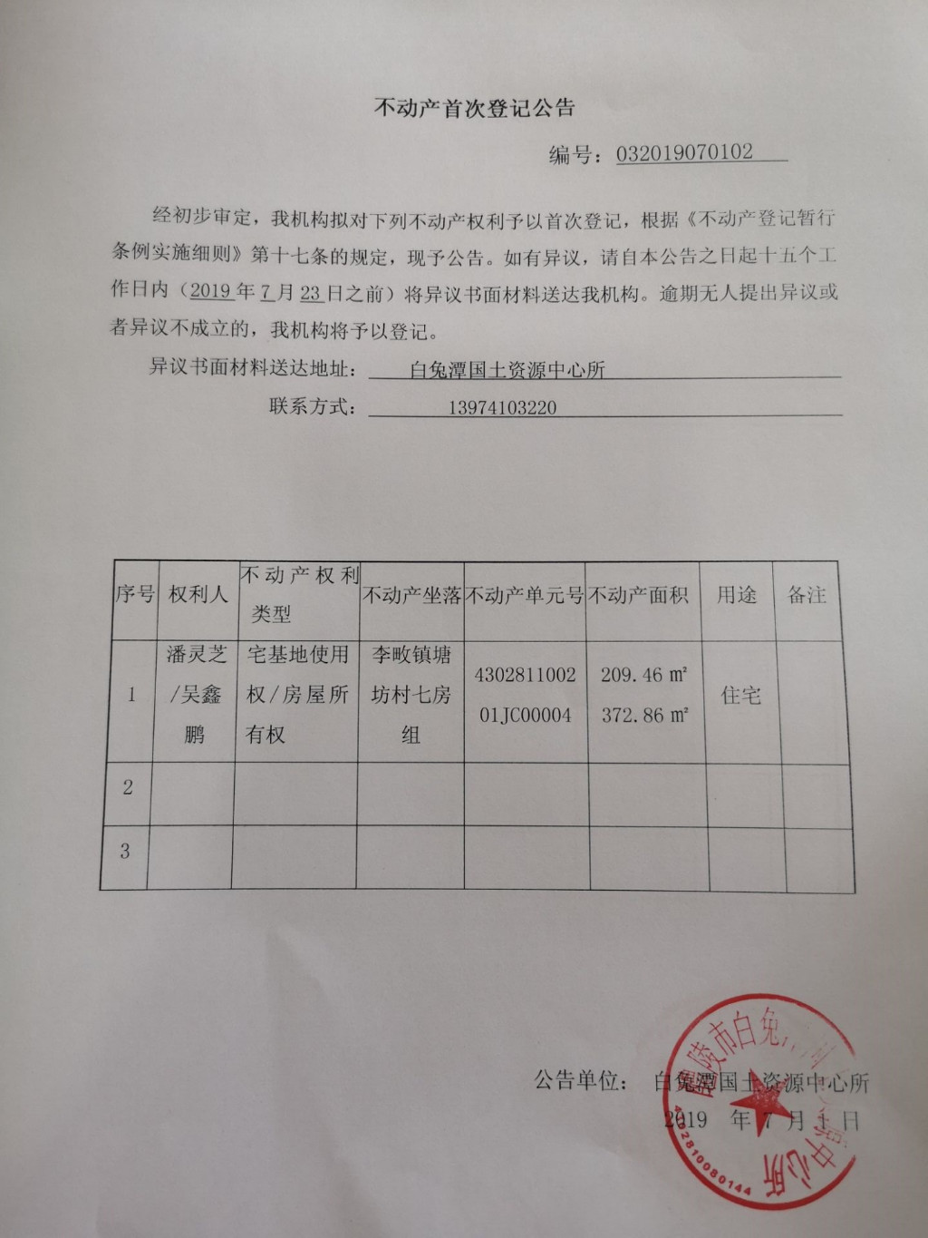 不动产首次登记公告(潘灵芝 吴鑫鹏)