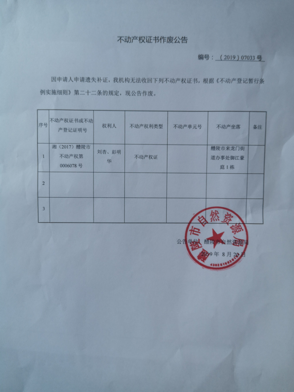 不动产权证书作废公告(刘杏、彭明华)