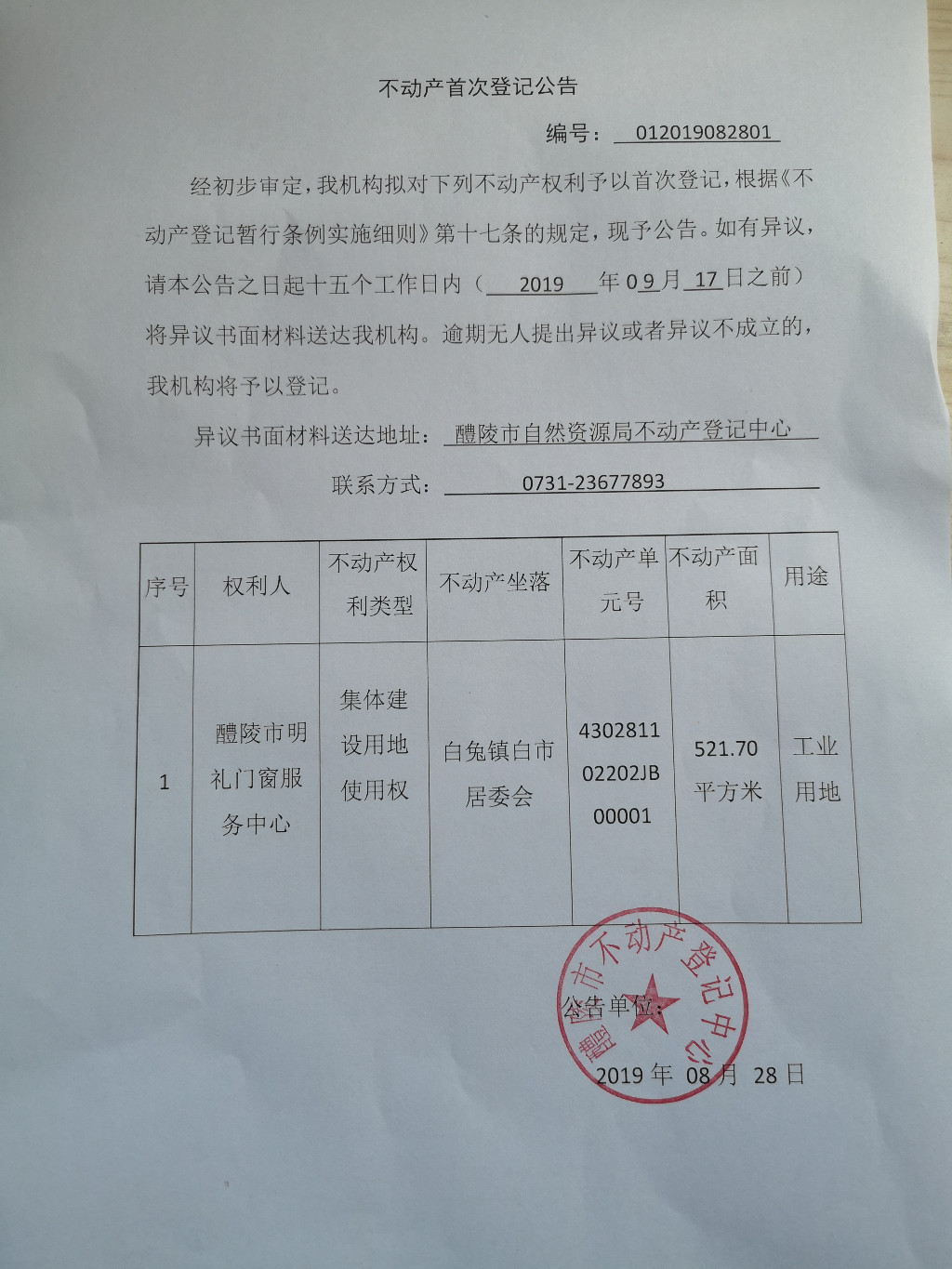 不动产首次登记公告(醴陵市明礼门窗服务中心)