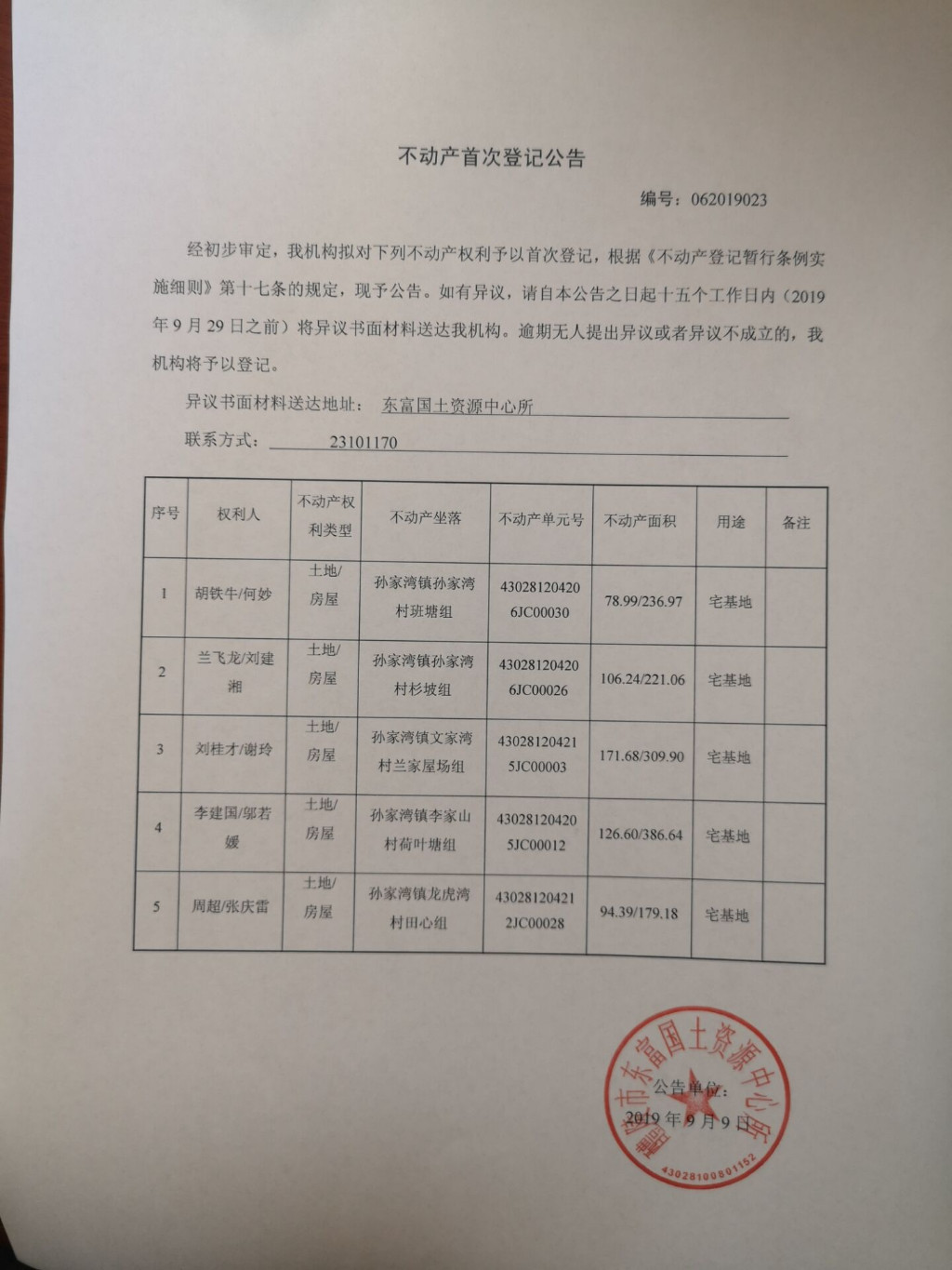 不动产首次登记公告(胡铁牛 何妙、兰飞龙 刘建湘、刘桂才 谢玲、李建国 邬若媛、周超 张庆雷)