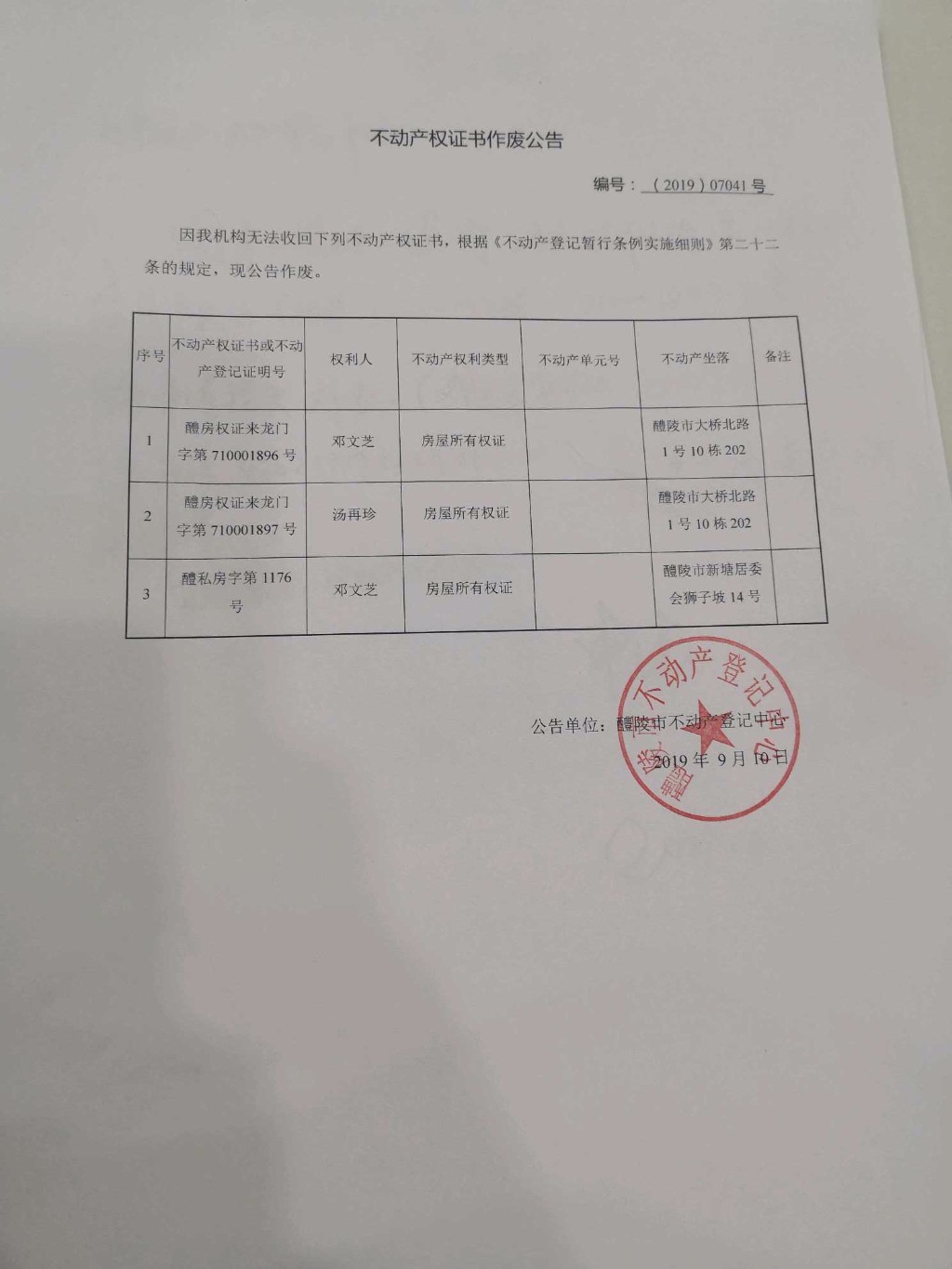 不动产权证书作废公告(邓文芝,汤再珍)