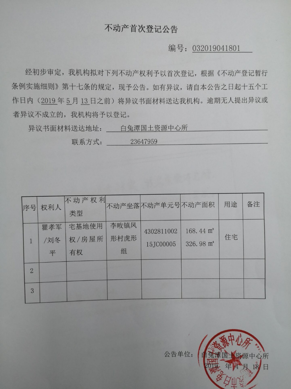 不动产首次登记公告(瞿孝军 刘冬平)