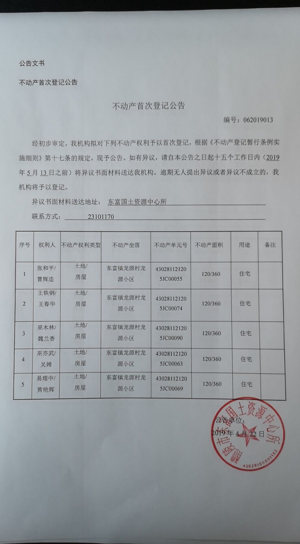 不动产首次登记公告(张和平 曹辉连、王铁钢 王春华、巫木林 魏兰香、巫亦武 吴娉、易理中 黄艳辉)