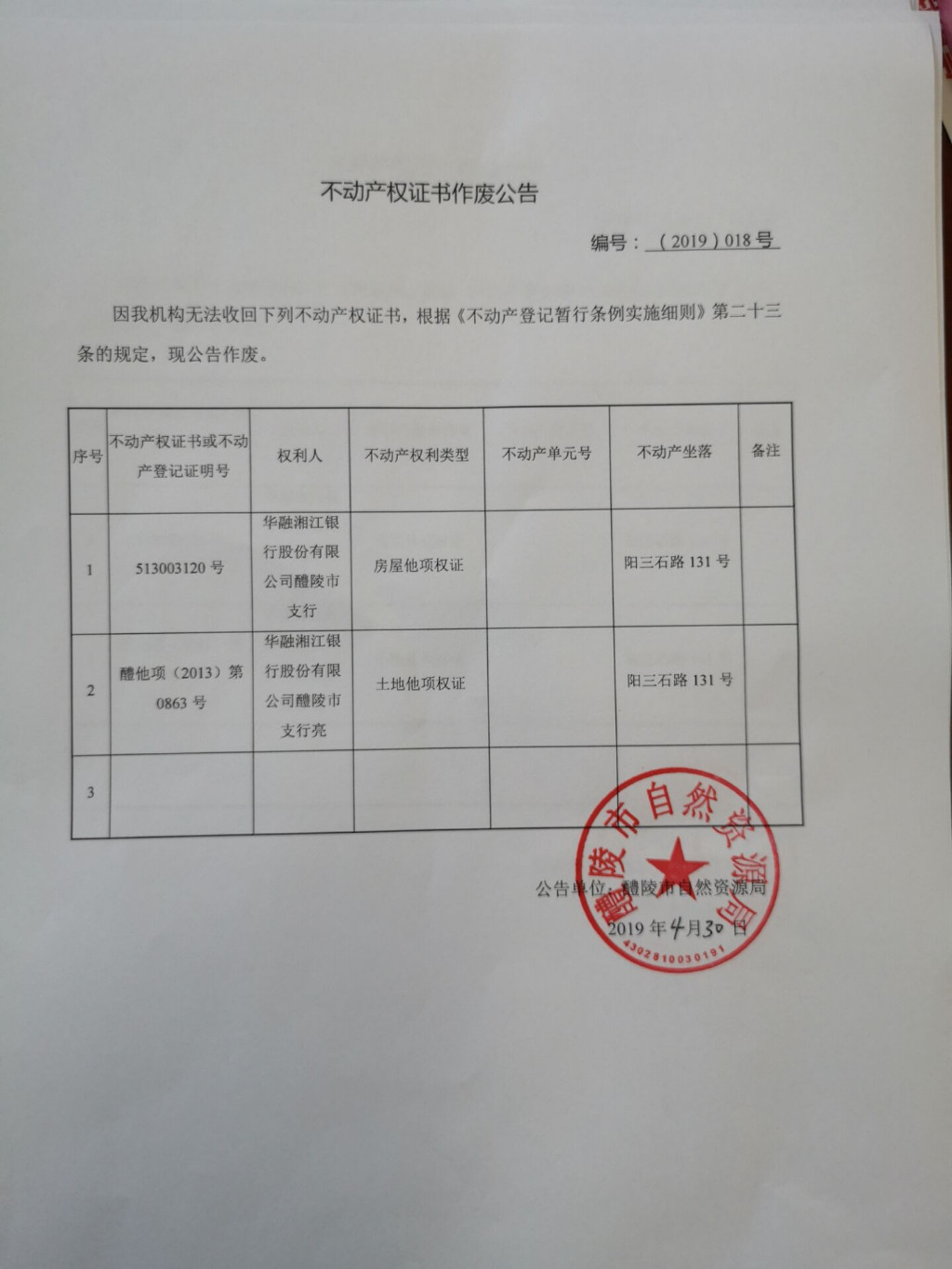 不动产权证书作废公告(华融湘江银行股份有限公司醴陵支行)