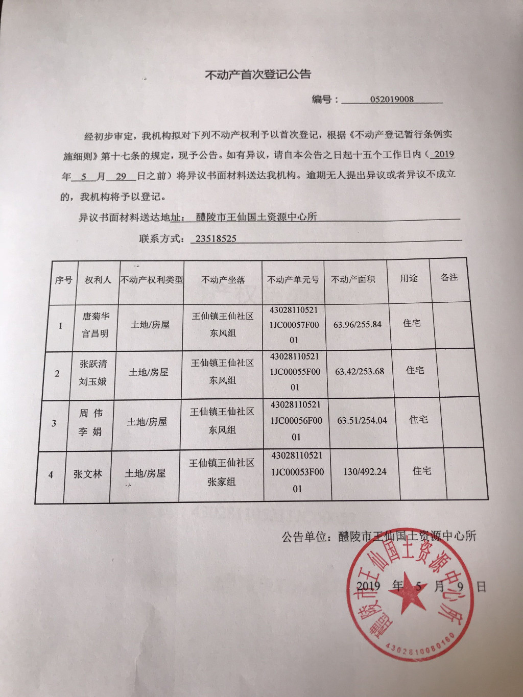 不动产首次登记公告(唐菊华 官昌明、张跃清 刘玉娥、周伟 李娟、张文林)