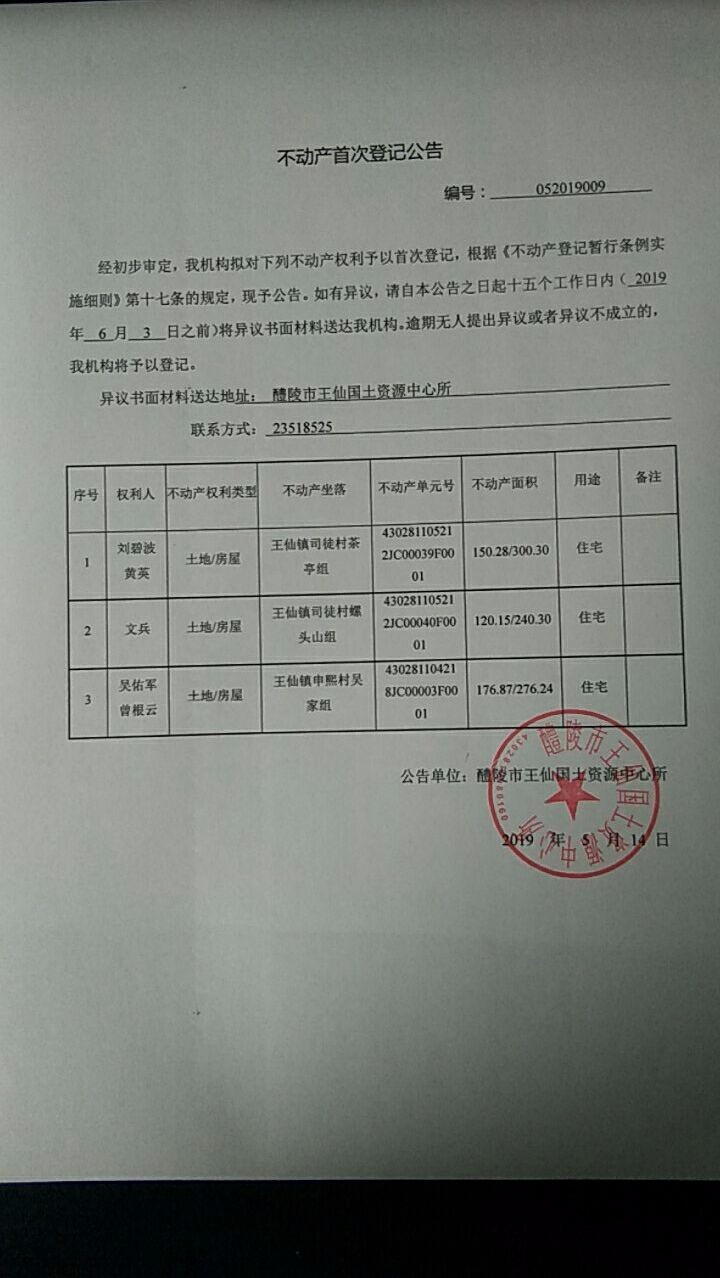 不动产首次登记公告(刘碧波 黄英、文兵、吴佑军 曾根云)