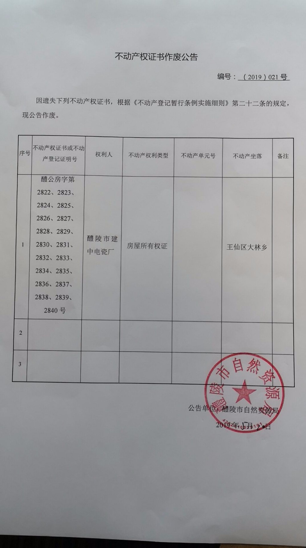 不动产权证书作废公告(醴陵市建中电瓷厂)