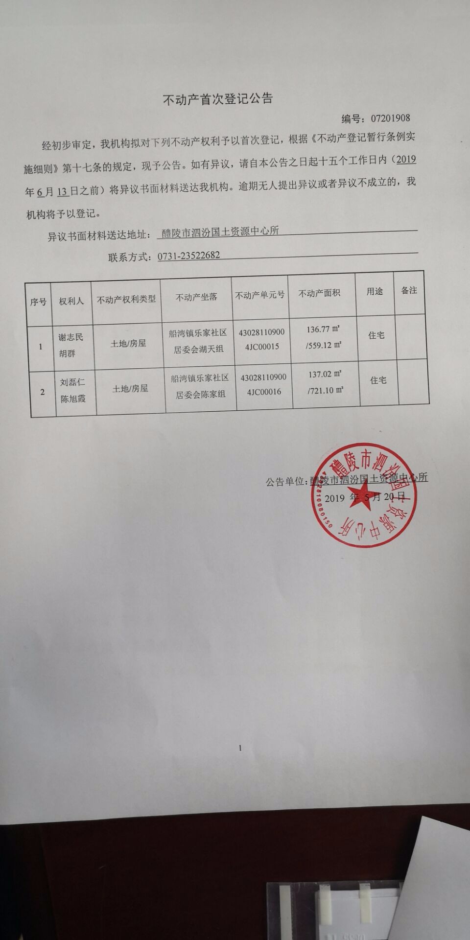不动产首次登记公告(谢志民 胡群、刘磊仁 陈旭霞)
