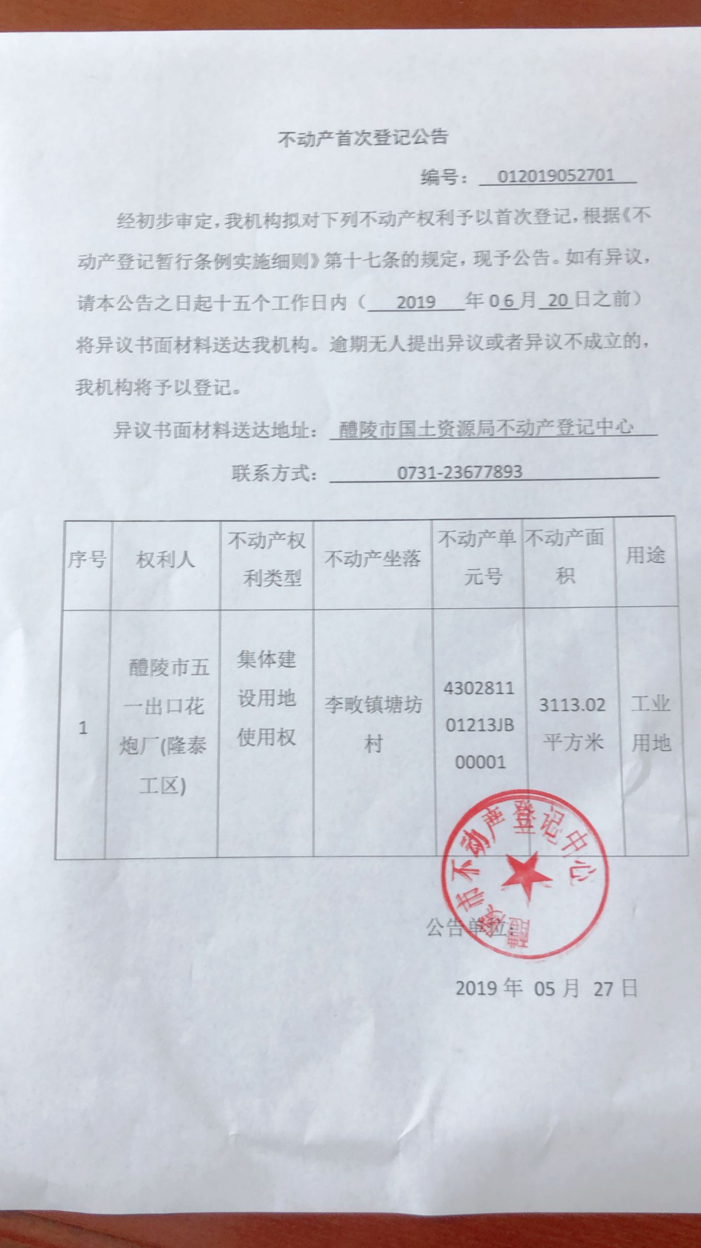 不动产首次登记公告(醴陵市五一出口花炮厂(隆泰工区))