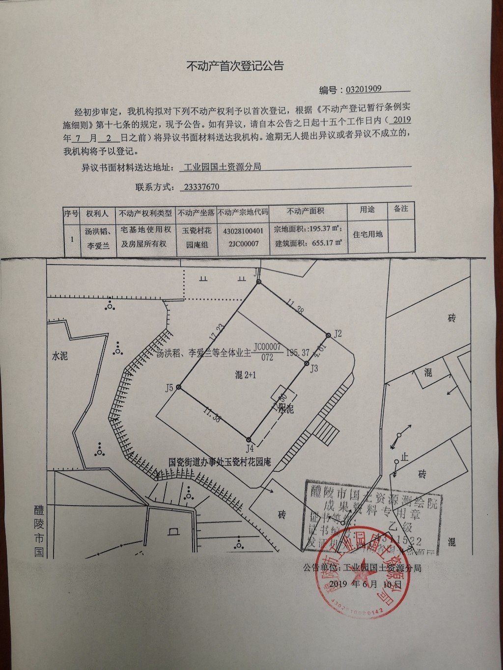 不动产首次登记公告(汤洪韬、李爱兰)