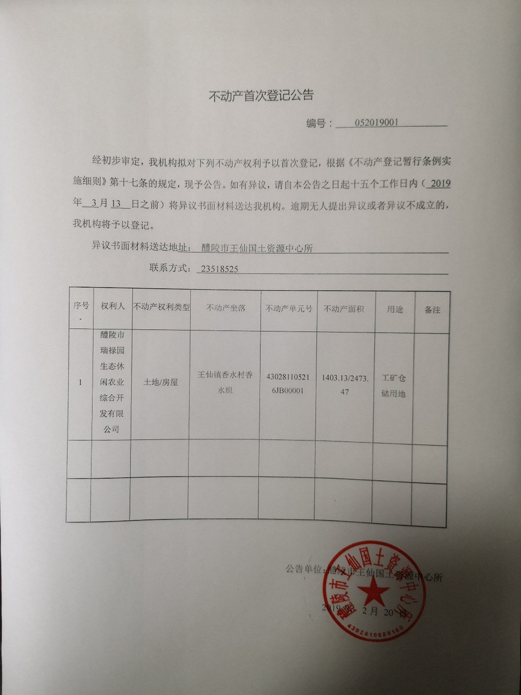 不动产首次登记公告(醴陵市瑞禄园生态休闲农业综合开发有限公司)