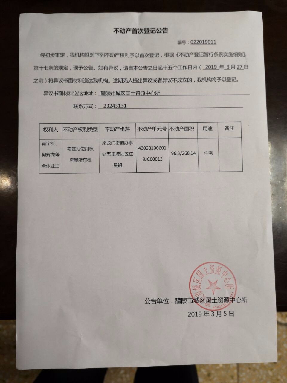 不动产首次登记公告(肖宇红、何辉龙等全体业主)