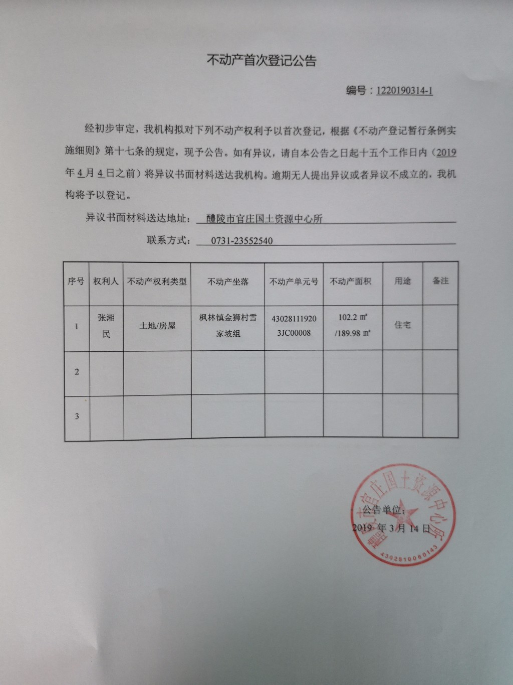 不动产首次登记公告(张湘民)