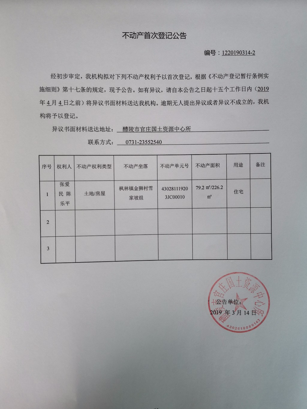 不动产首次登记公告(张爱民、陈乐平)