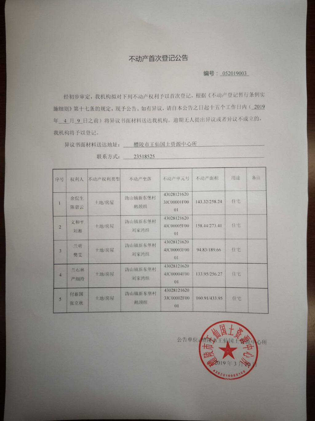 不动产首次登记公告(余侃生 陈碧云、文和平 刘湘、兰明 樊雯、兰石林 严细玲、付新国 张立秋)