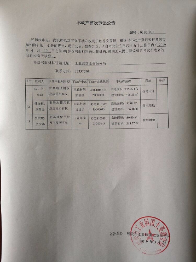 不动产首次登记公告(应田华、李莉、钟许根、巫冬民、吴汝妮、吴汝娜)