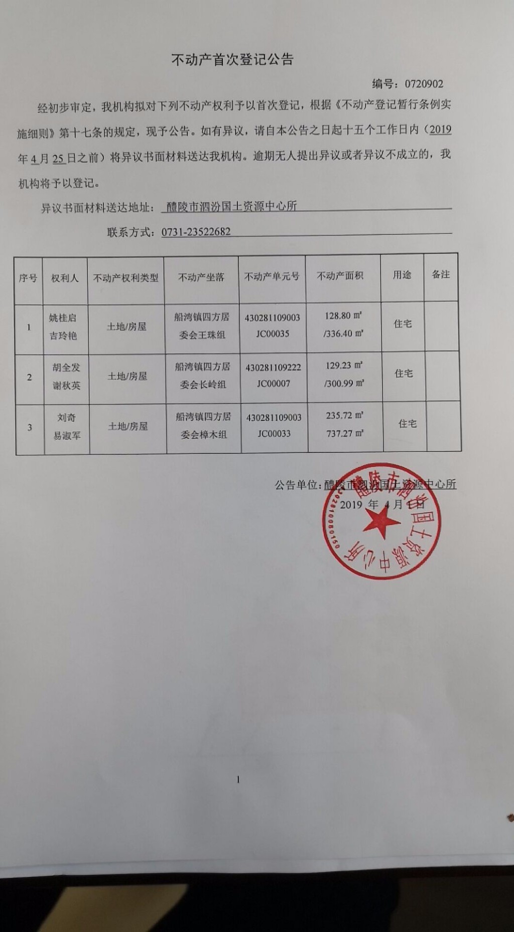 不动产首次登记公告(姚桂启 吉玲艳、胡全发 谢秋英、刘奇 易淑军)