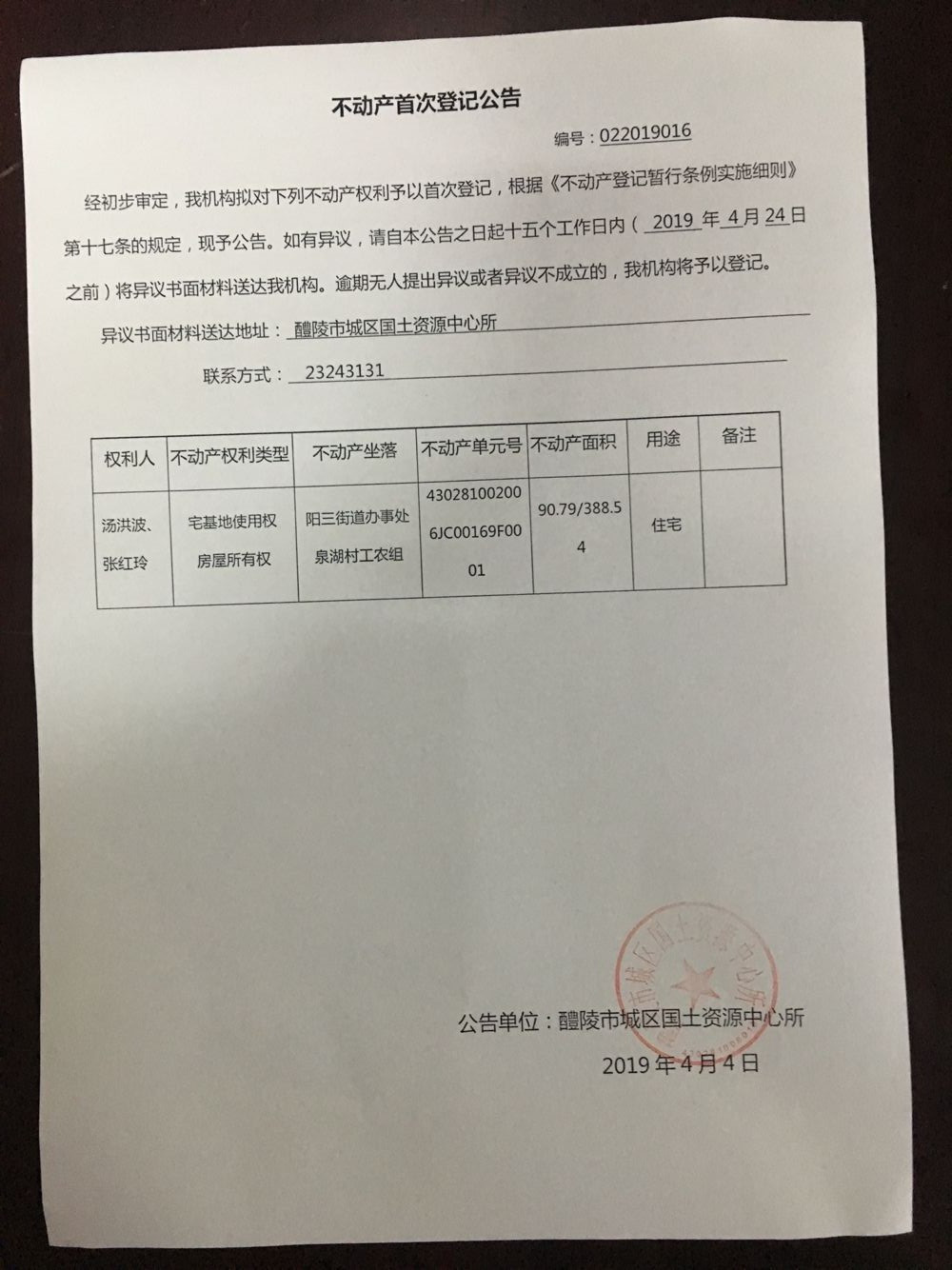 不动产首次登记公告(汤洪波 张红玲)