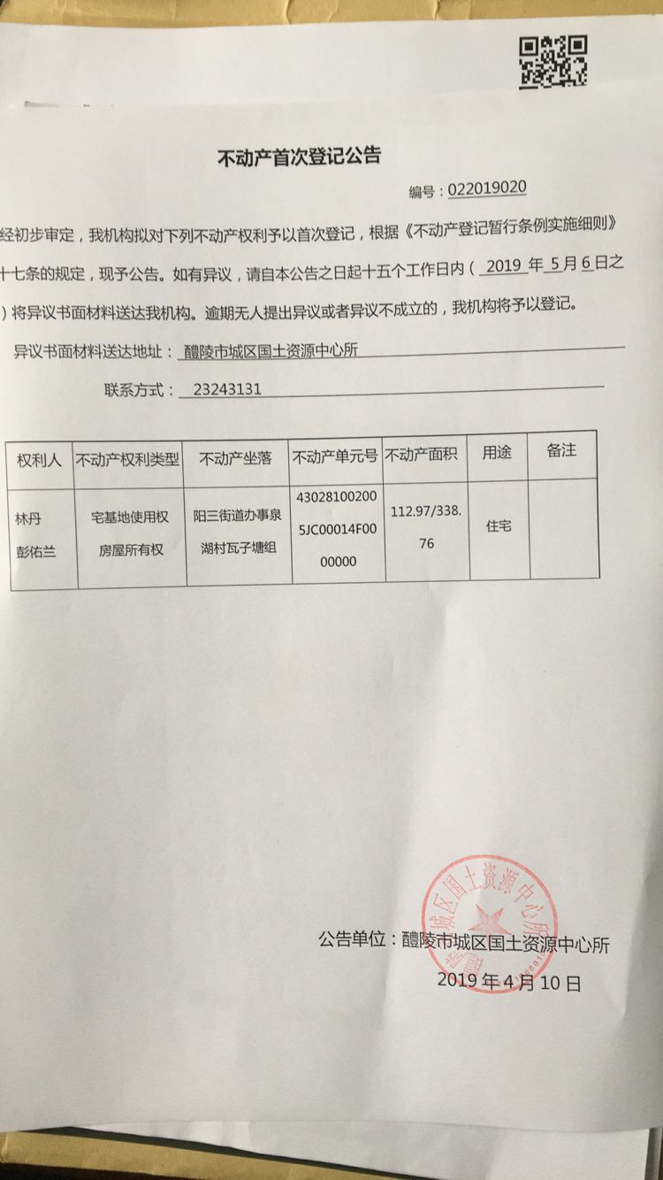 不动产首次登记公告(林丹 彭佑兰)