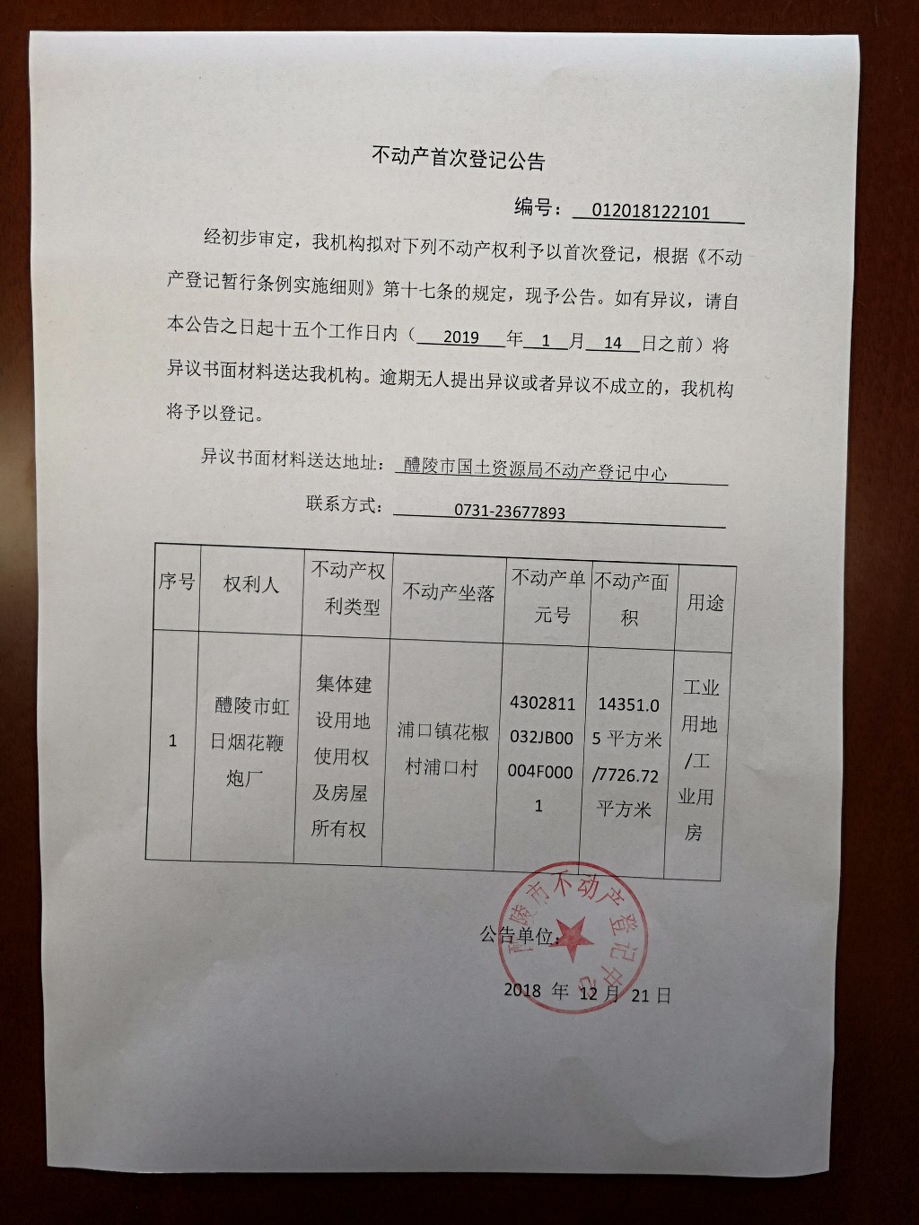 不动产首次登记公告(醴陵市虹日烟花鞭炮厂)