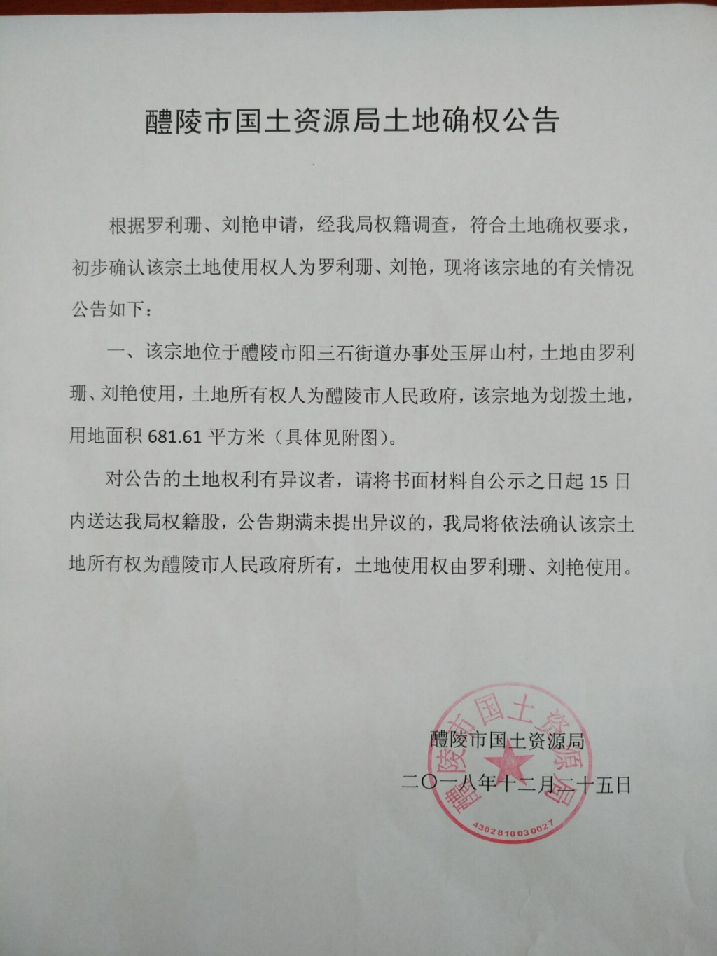 醴陵市国土资源局土地确权公告(罗利珊 刘艳)