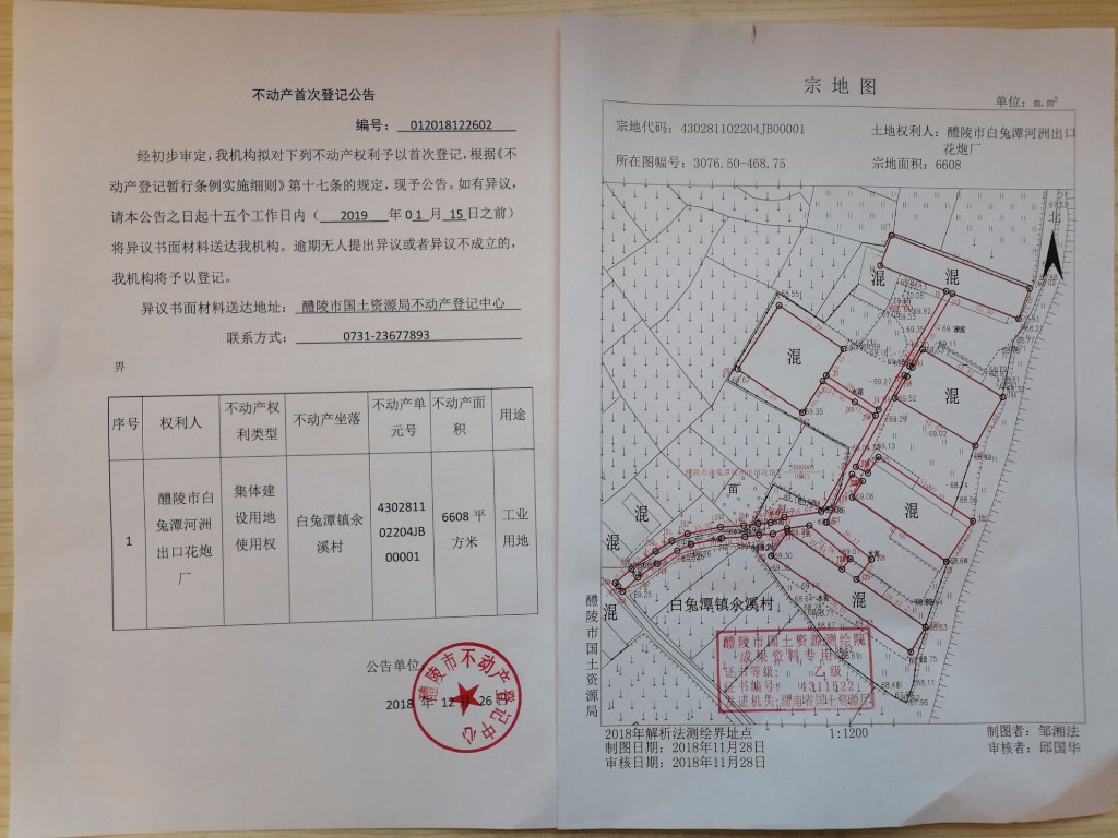 不动产首次登记公告(醴陵市白兔潭河洲出口花炮厂)