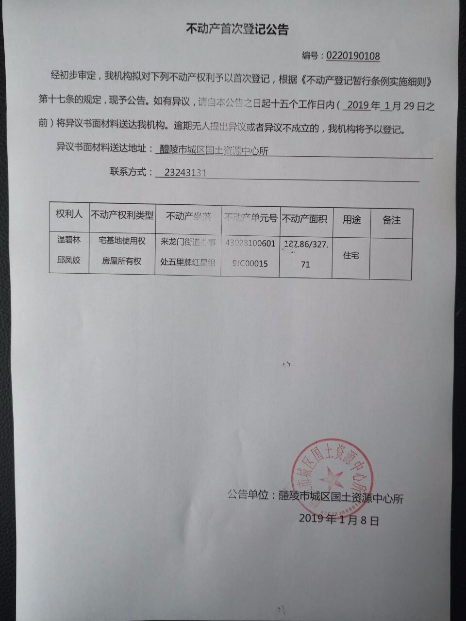 不动产首次登记公告(温碧林、邱凤姣)
