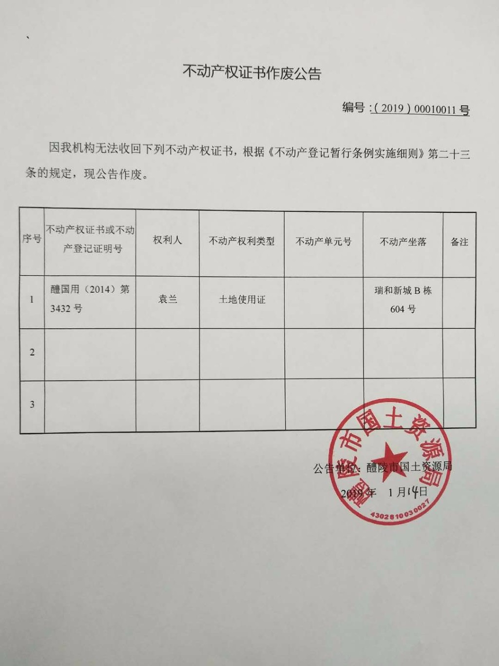 不动产权证书作废公告(袁兰)