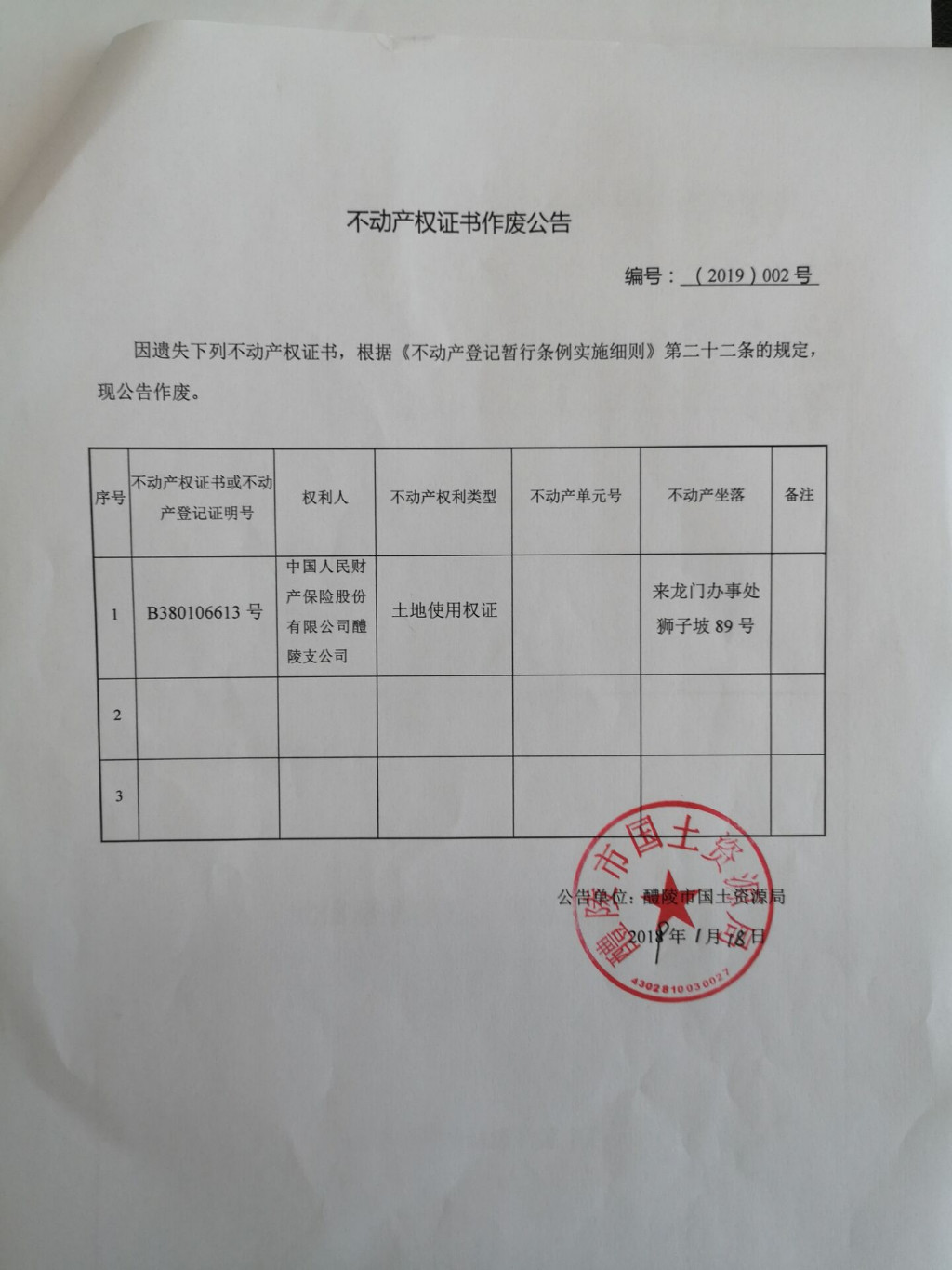 不动产权证书作废公告(中国人民财产保险股份有限公司醴陵支公司)