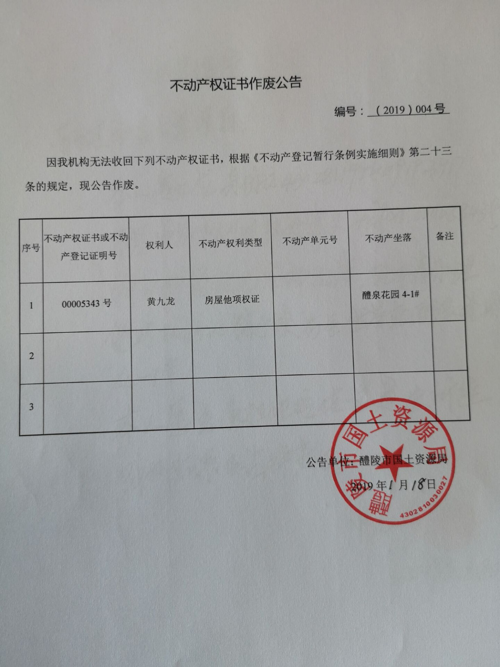 不动产权证书作废公告(黄九龙 房屋他项权证)