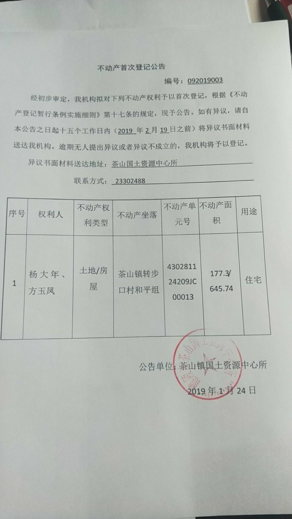 不动产首次登记公告(杨大年 方玉凤)