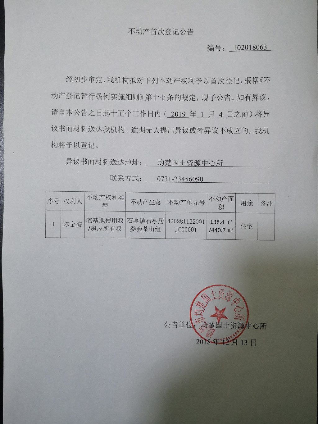 不动产首次登记公告(陈金梅)