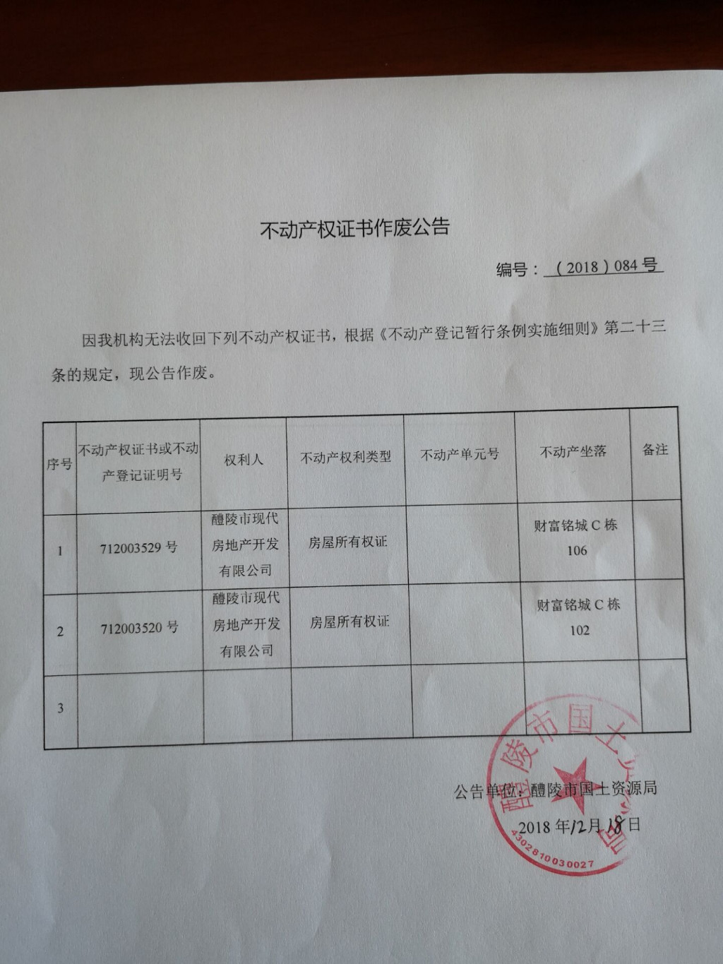 不动产权证书作废公告(醴陵市现代房地产开发有限公司)