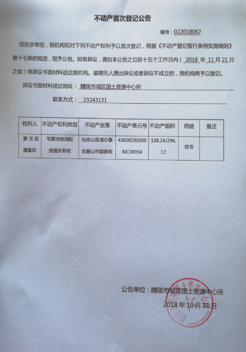 不动产首次登记公告(谢玉剑 谭喜欢)