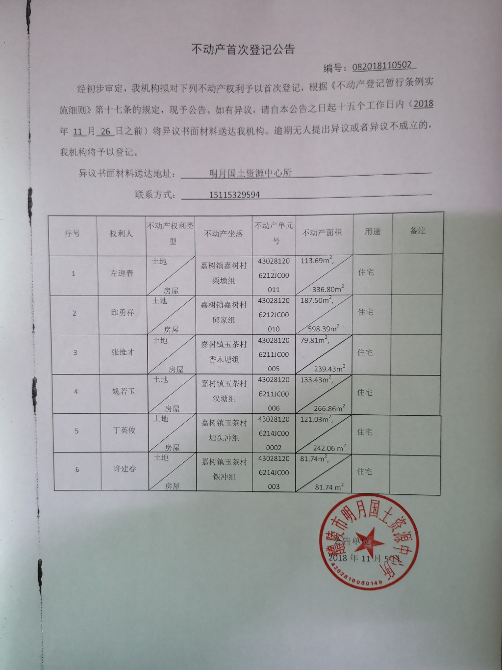 不动产首次登记公告(左迎春、邱勇祥、张雄才、姚若玉、丁英俊、许建春)