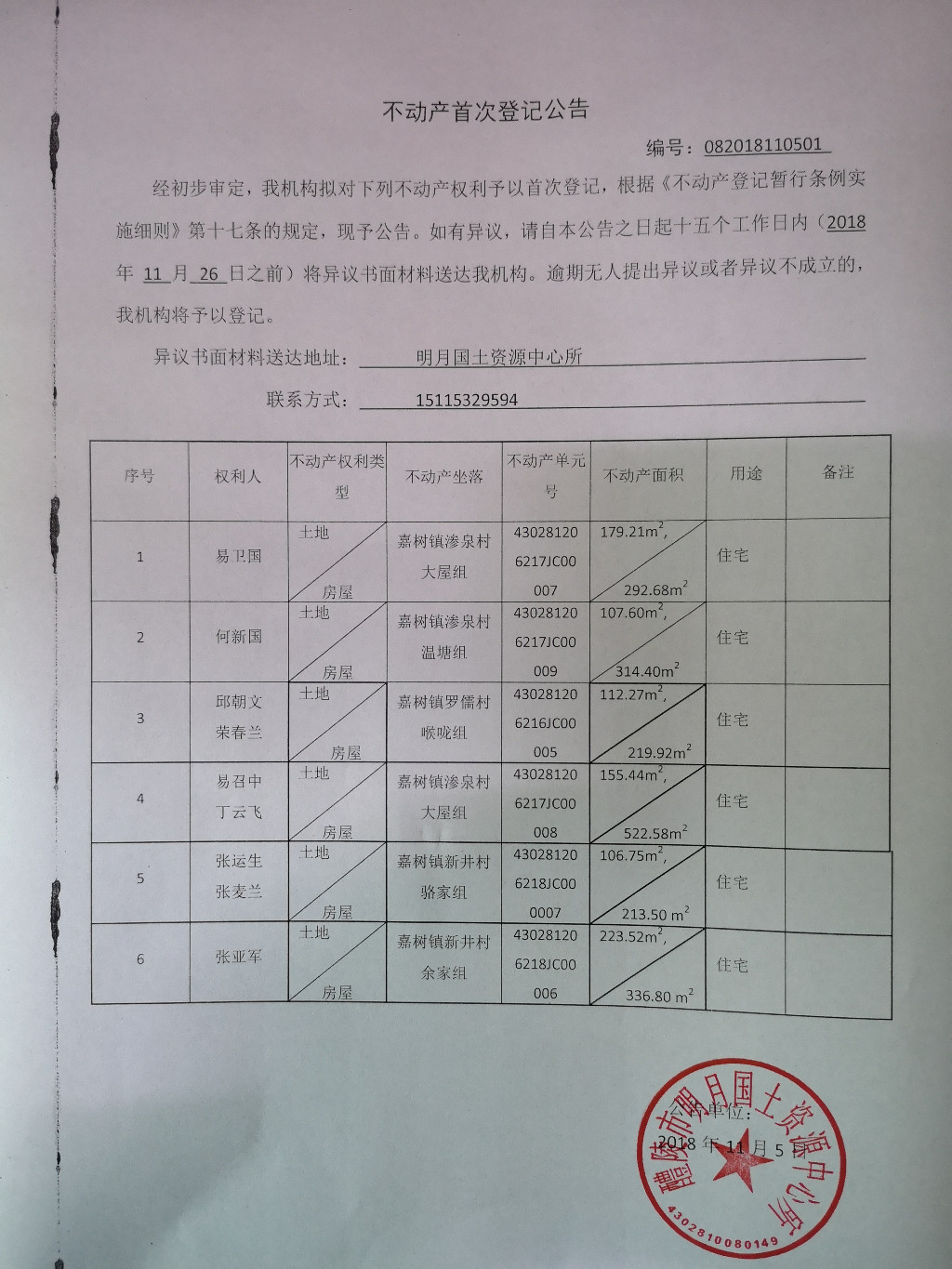 不动产首次登记公告(易卫国、何新国、邱朝文 荣春兰、易召中 丁云飞、张运生 张麦兰、张亚军)