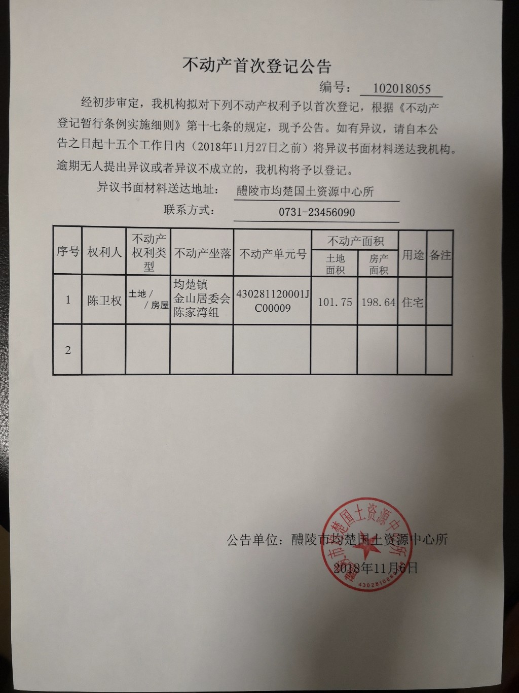 不动产首次登记公告(陈卫权)