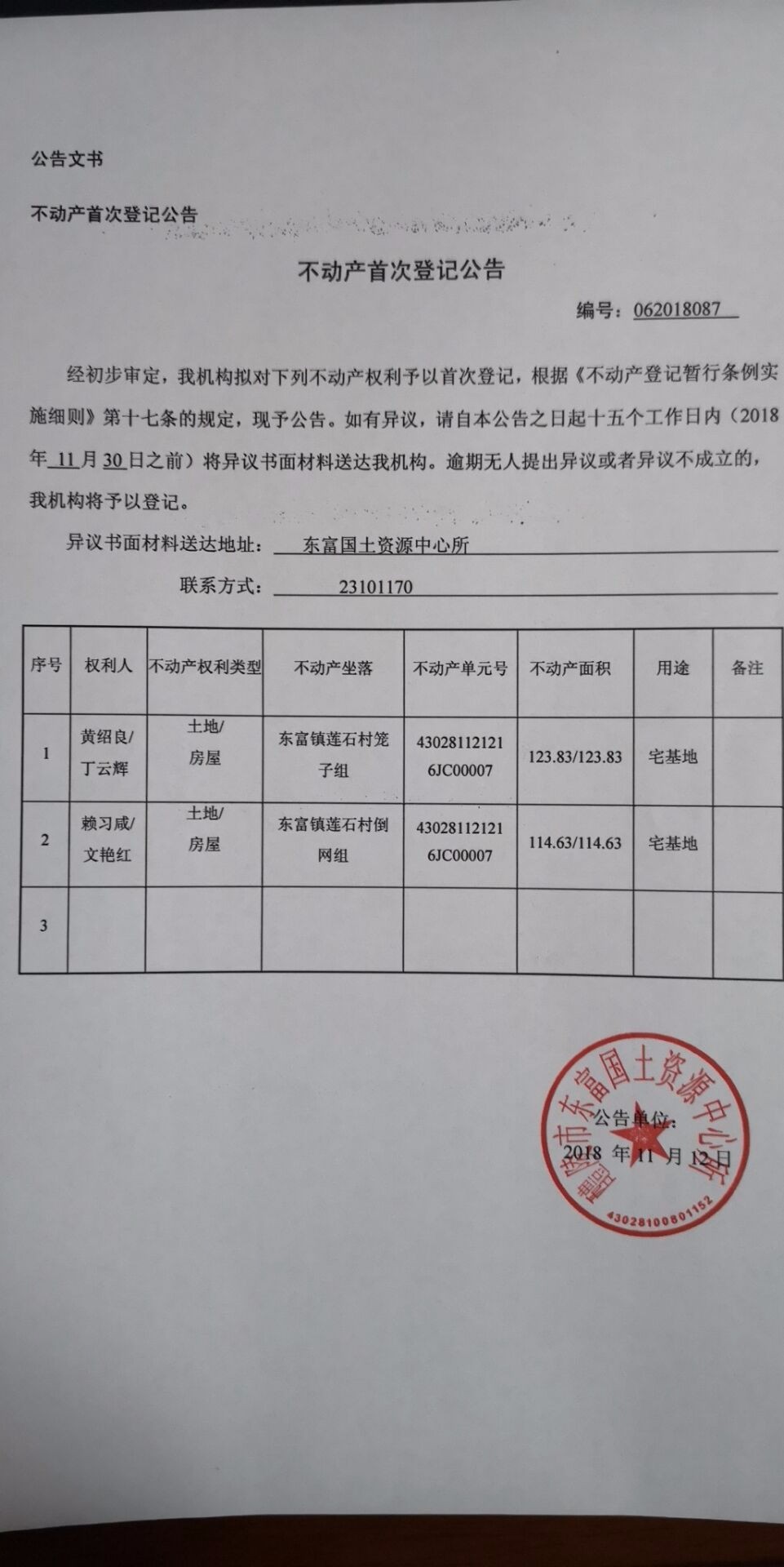 不动产首次登记公告(黄绍良、丁云辉、赖习咸、文艳红)