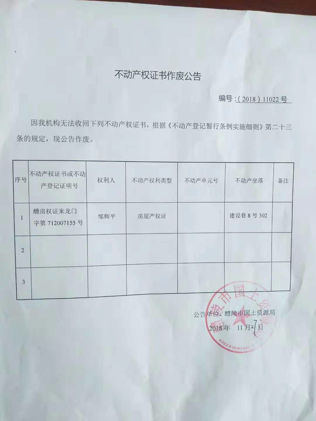 不动产权证书作废公告(邹辉平)
