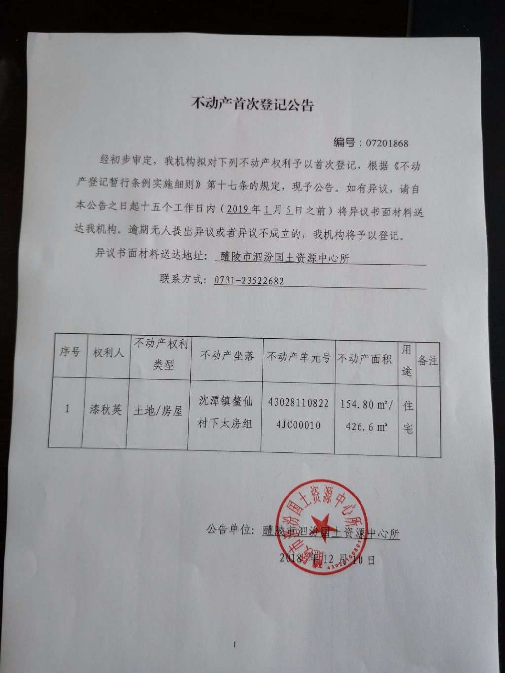 不动产首次登记公告(漆秋英)
