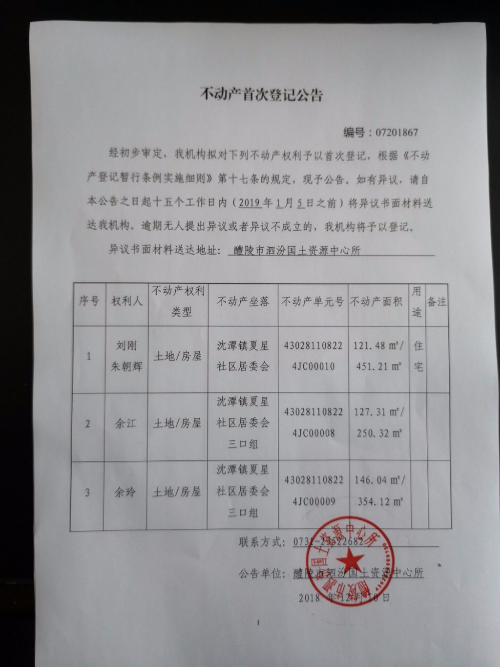 不动产首次登记公告(刘刚、朱朝辉、余江、余玲)