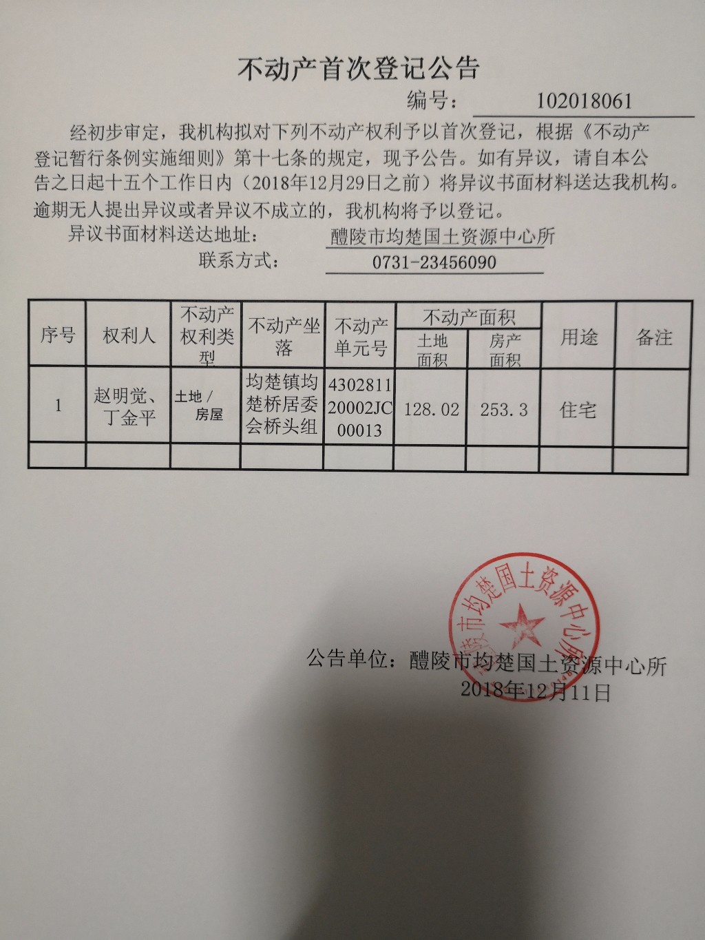 不动产首次登记公告(赵明觉、丁金平)
