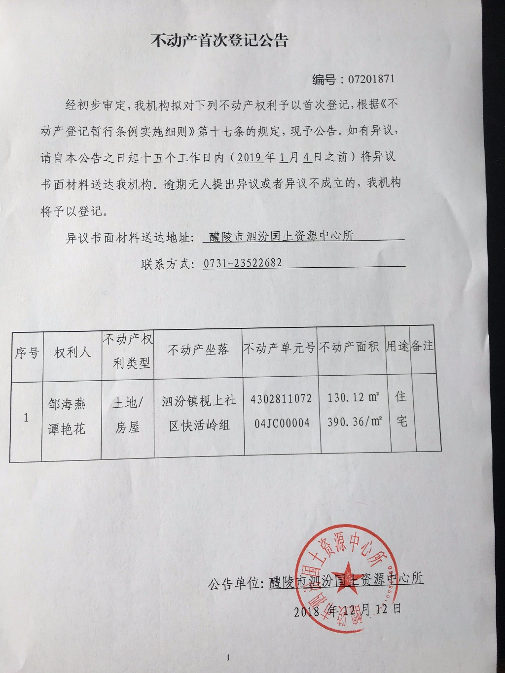 不动产首次登记公告(邹海燕、谭艳花)