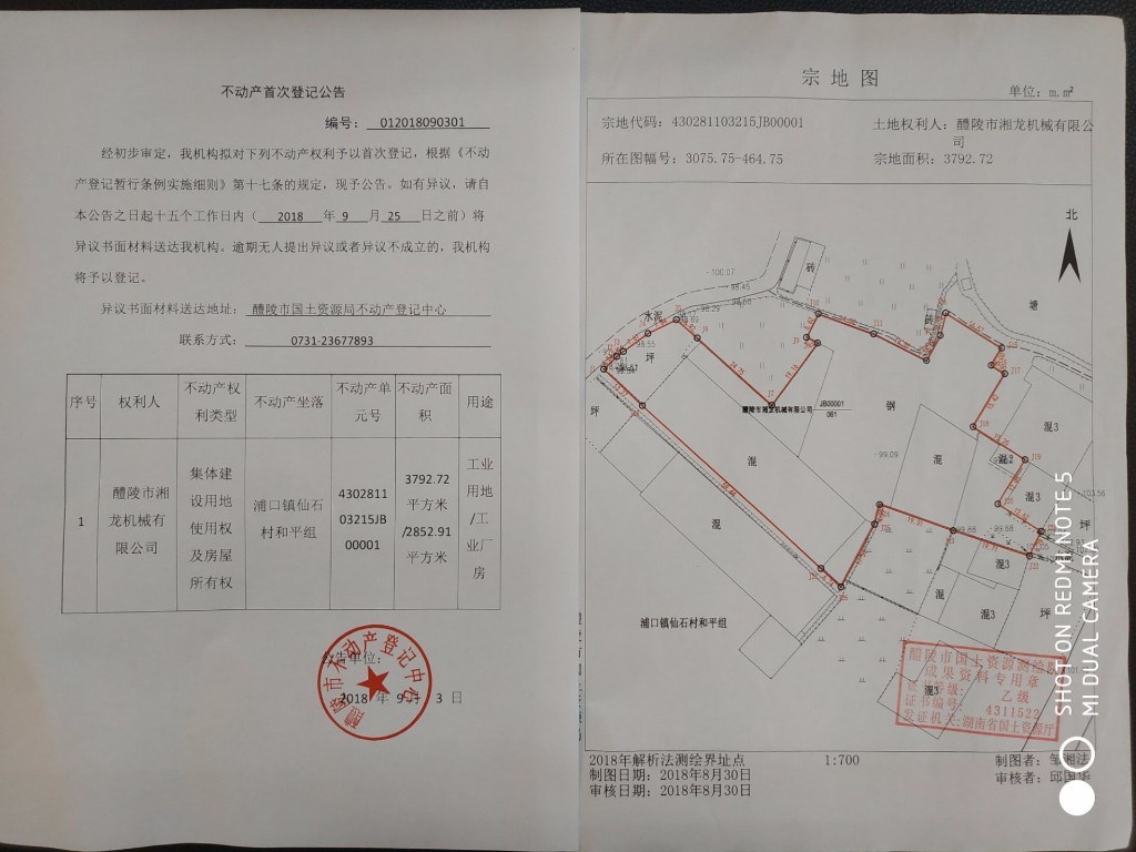 不动产首次登记公告(醴陵市湘龙机械有限公司)
