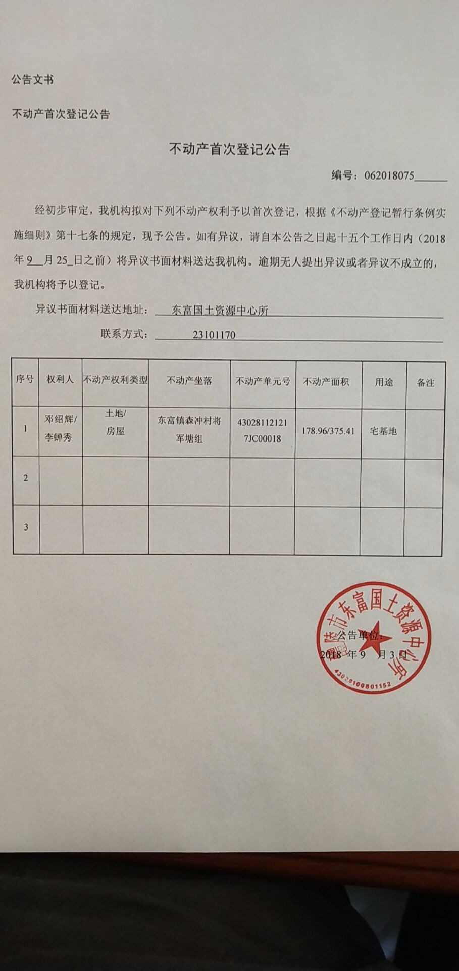 不动产首次登记公告(邓绍辉、李婵秀)